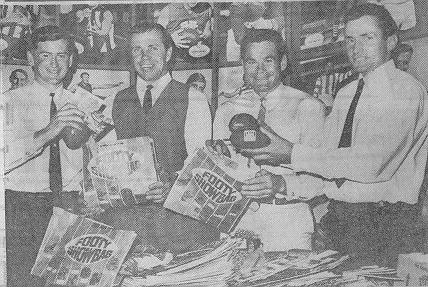 In an early example of their marketing genius, in the late 60's North Melbourne ran a stall at the Royal Melbourne Show, selling 'Footy Showbags' (30c got you 10 items ranging from a ruler and chewing gum to a 'flying saucer'). North players manned the stand, and stars from other clubs also came along to sell the bags and sign autographs. As you can see from the pic, they pulled in some big names: